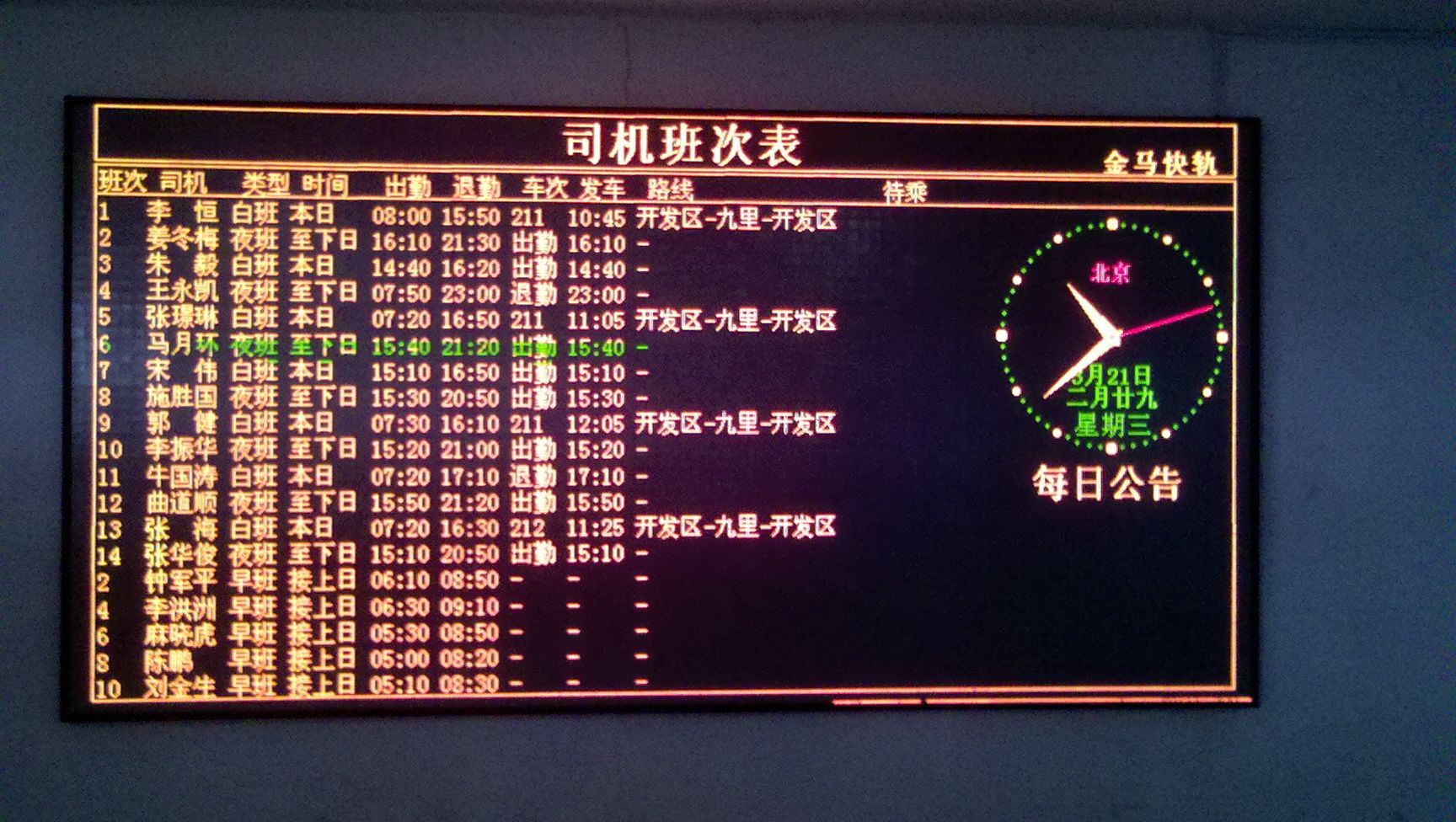 大屏幕及查詢系統(tǒng)滿足地鐵列車運(yùn)營(yíng)時(shí)刻表和司機(jī)相關(guān)作業(yè)規(guī)定的需要,動(dòng)態(tài)掌握司機(jī)狀況,自動(dòng)生成合理的司機(jī)出乘計(jì)劃,使派班管理員減少重復(fù)勞動(dòng),提高工作效率。同時(shí)避免人為因素出現(xiàn)的計(jì)劃編制差錯(cuò),實(shí)現(xiàn)對(duì)司機(jī)的科學(xué)、規(guī)范管理。